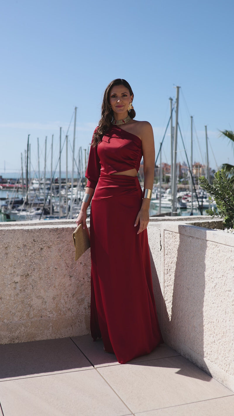 Vestido invitada buganvilla, vestido midi asimétrico, vestido elegante manga larga, vestido fiesta color intenso, vestido formal mujer, tendencias invitadas 2026