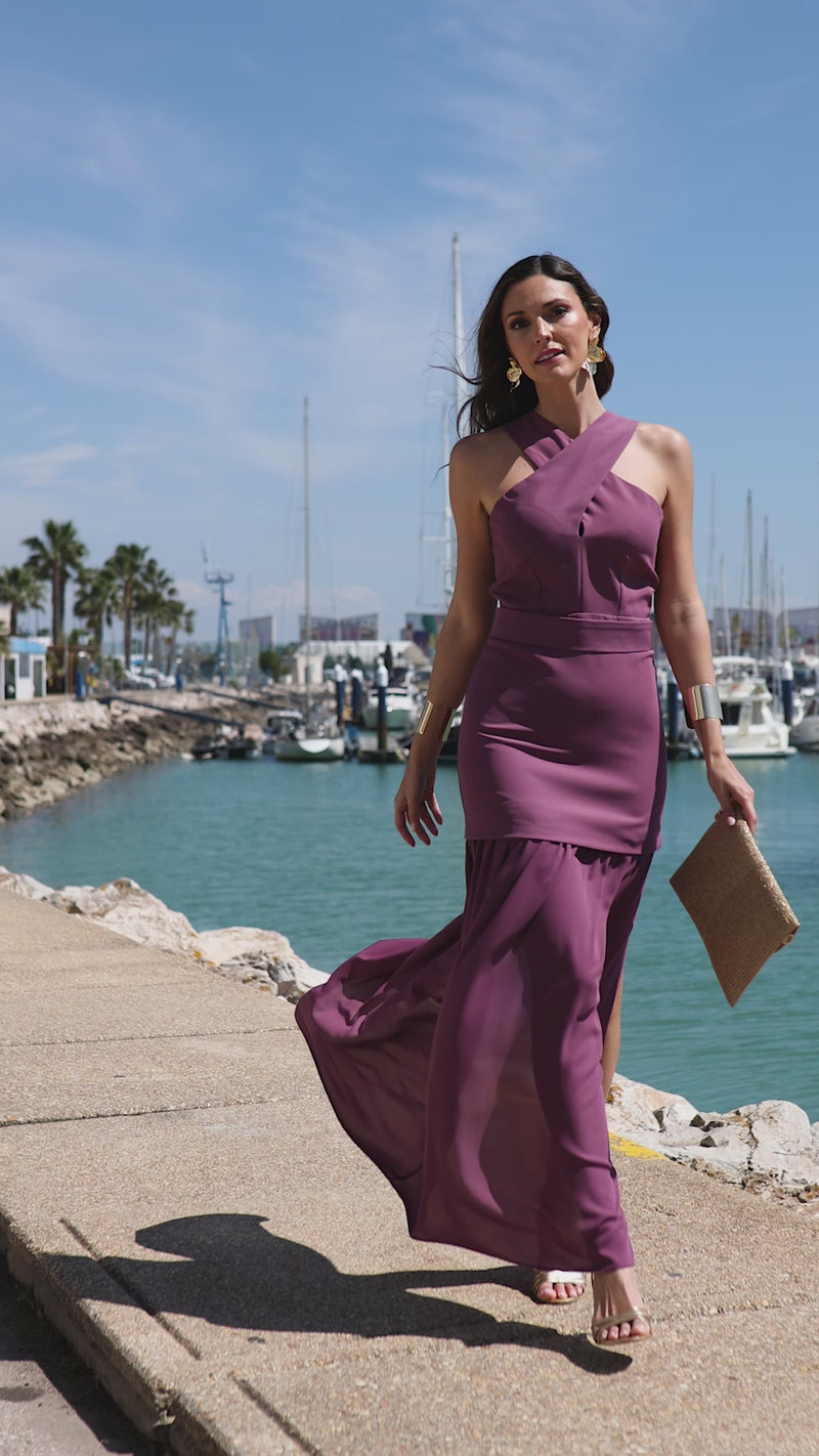 Vestido largo halter doble falda berenjena
