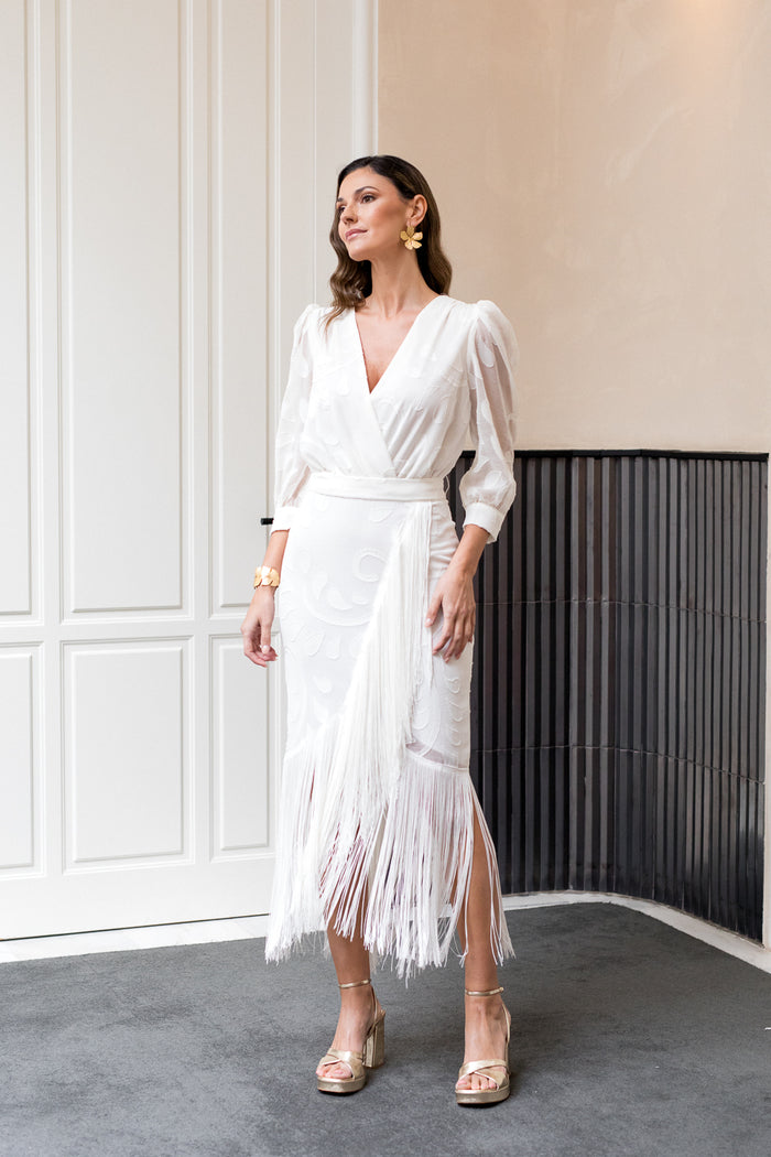 Vestido blanco brocado con flecos - EXCLUSIVO ONLINE