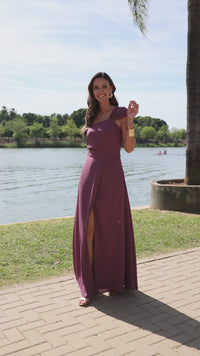 Este vestido largo en rojo intenso destaca por su diseño elegante y minimalista, con un escote asimétrico de un solo hombro que aporta personalidad y sofisticación. Su corte fluido y la cintura marcada estilizan la figura, creando una silueta limpia y favorecedora.