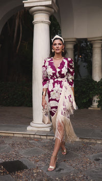 Si buscas un vestido de lo más especial, con un tejido estampado, flecos en el bajo que le aportan mucho movimiento, para una ocasión tan especial necesitas este vestido.