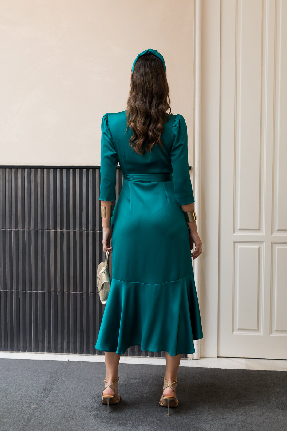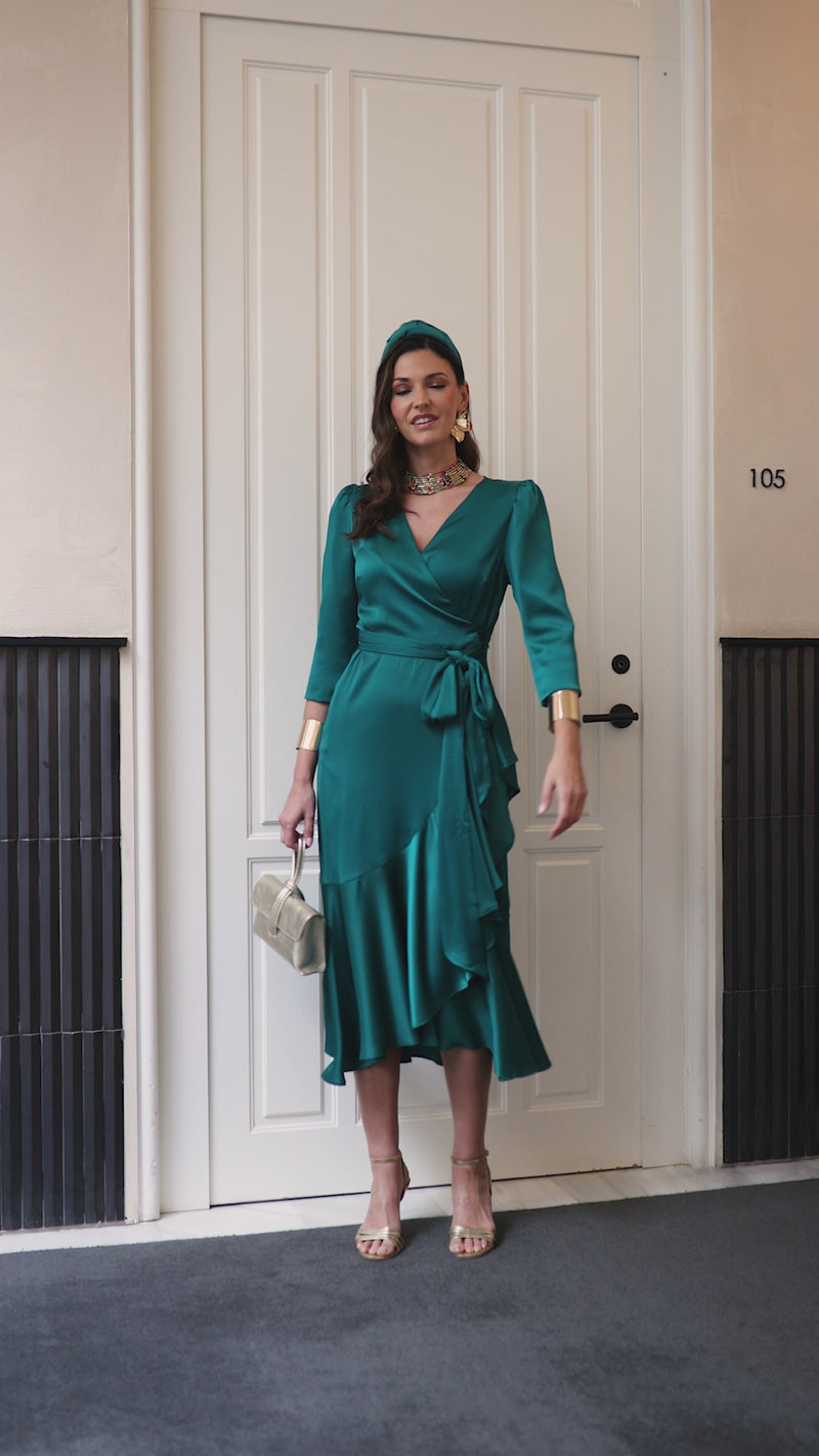 Este vestido cruzado midi en tono verde petróleo es la opción perfecta para invitadas que buscan un look elegante, con movimiento y muy favorecedor. Su escote en pico y el corte tipo wrap marcan la cintura de forma natural, mientras que los volantes en la falda crean una silueta fluida que acompaña cada paso. Ideal para bodas de día, comuniones y eventos de entretiempo, es un diseño cómodo y sofisticado con el que te sentirás especial durante toda la celebración.