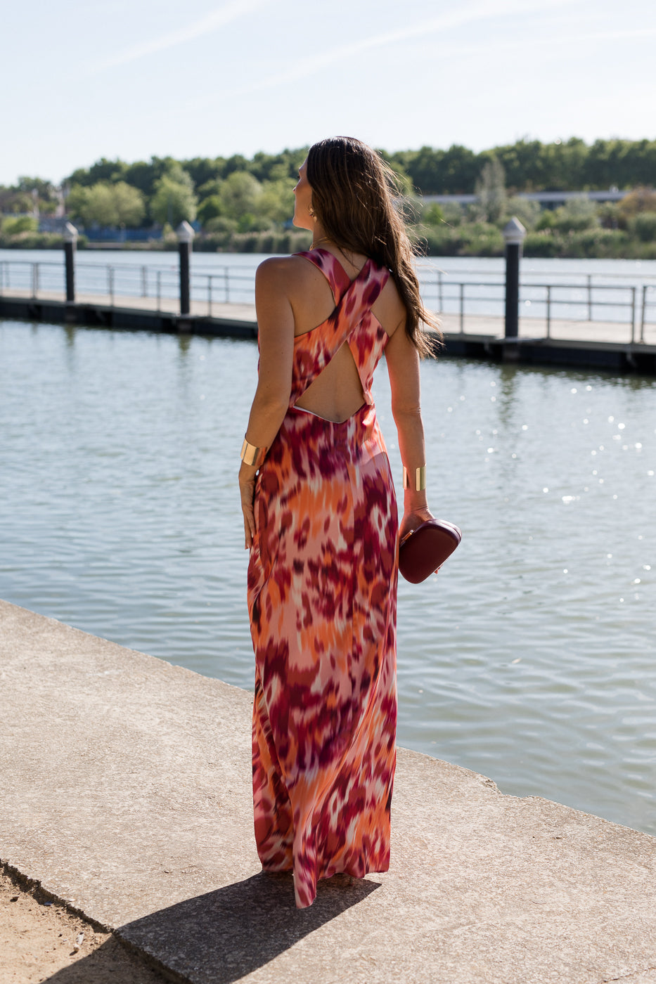 Vibrante y elegante, este vestido largo destaca por su estampado abstracto en tonos azul, verde y blanco, que aporta un aire fresco y moderno. Su diseño de tirantes cruzados en la espalda añade un toque sensual y original, mientras que el corte recto con caída fluida estiliza la figura con naturalidad.