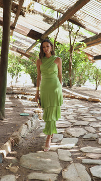 Vestido midi cuello halter multivolantes