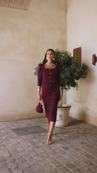 Conjunto de top con silueta de chaquetita más una falda de tubo de cintura alta.