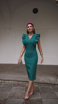 Este vestido de invitada es muy especial, con un maxi volante en el escote, corte en cintura y cinturón.