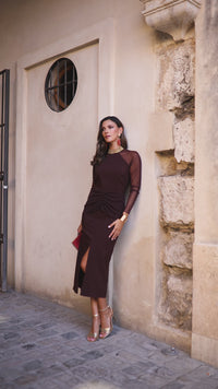 Vestido midi manga larga tul marrón chocolate