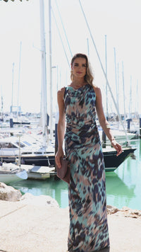 Vibrante y elegante, este vestido largo destaca por su estampado abstracto en tonos azul, verde y blanco, que aporta un aire fresco y moderno. Su diseño de tirantes cruzados en la espalda añade un toque sensual y original, mientras que el corte recto con caída fluida estiliza la figura con naturalidad.