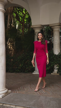 Este vestido de invitada es muy especial, su drapeado lateral favorece la silueta y el detalle de la espalda hará que seas la envidia del resto de invitadas.
