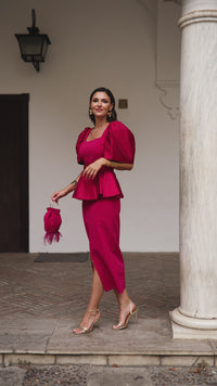 Este vestido de invitada es muy especial, con un maxi volante en el escote, corte en cintura y cinturón.