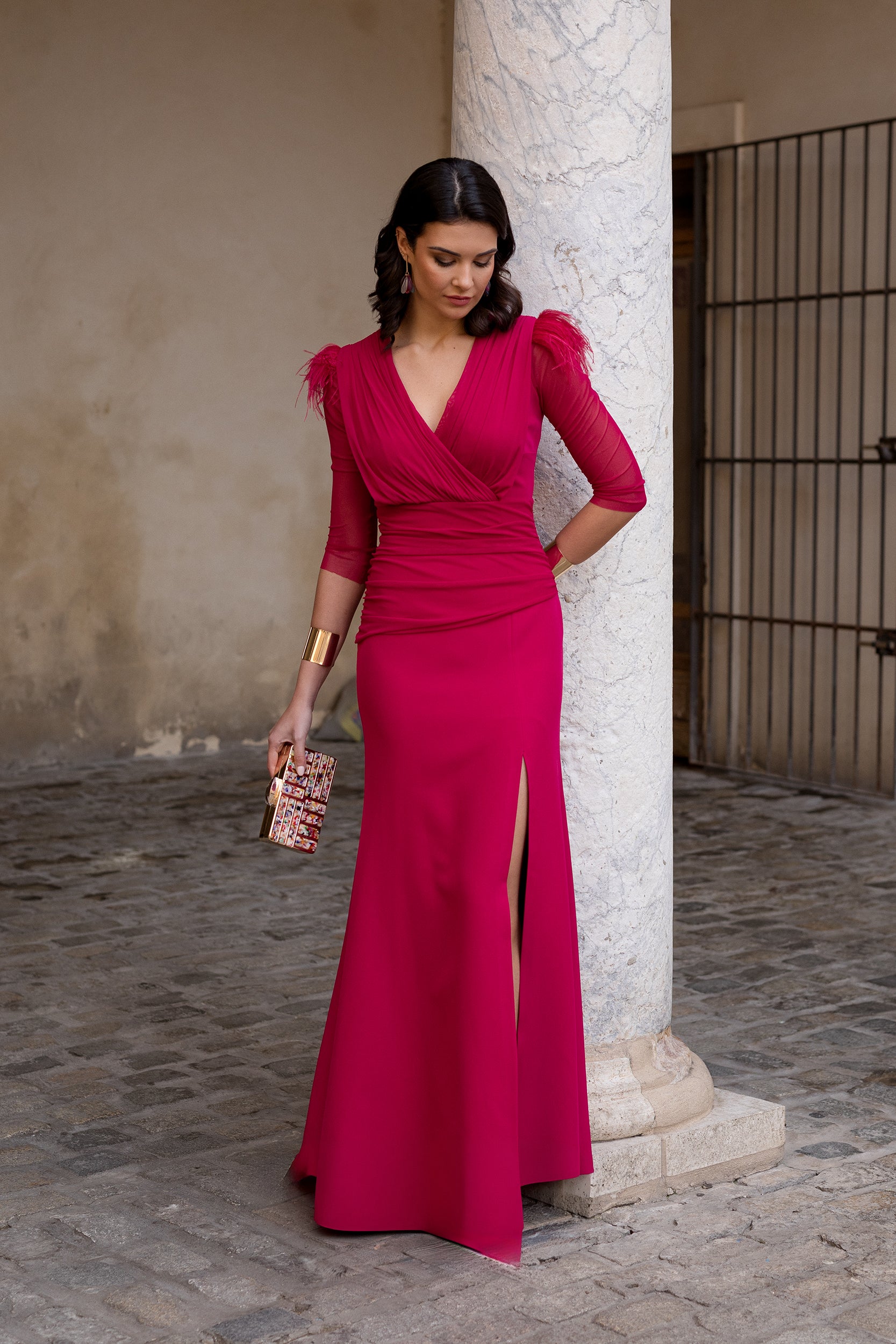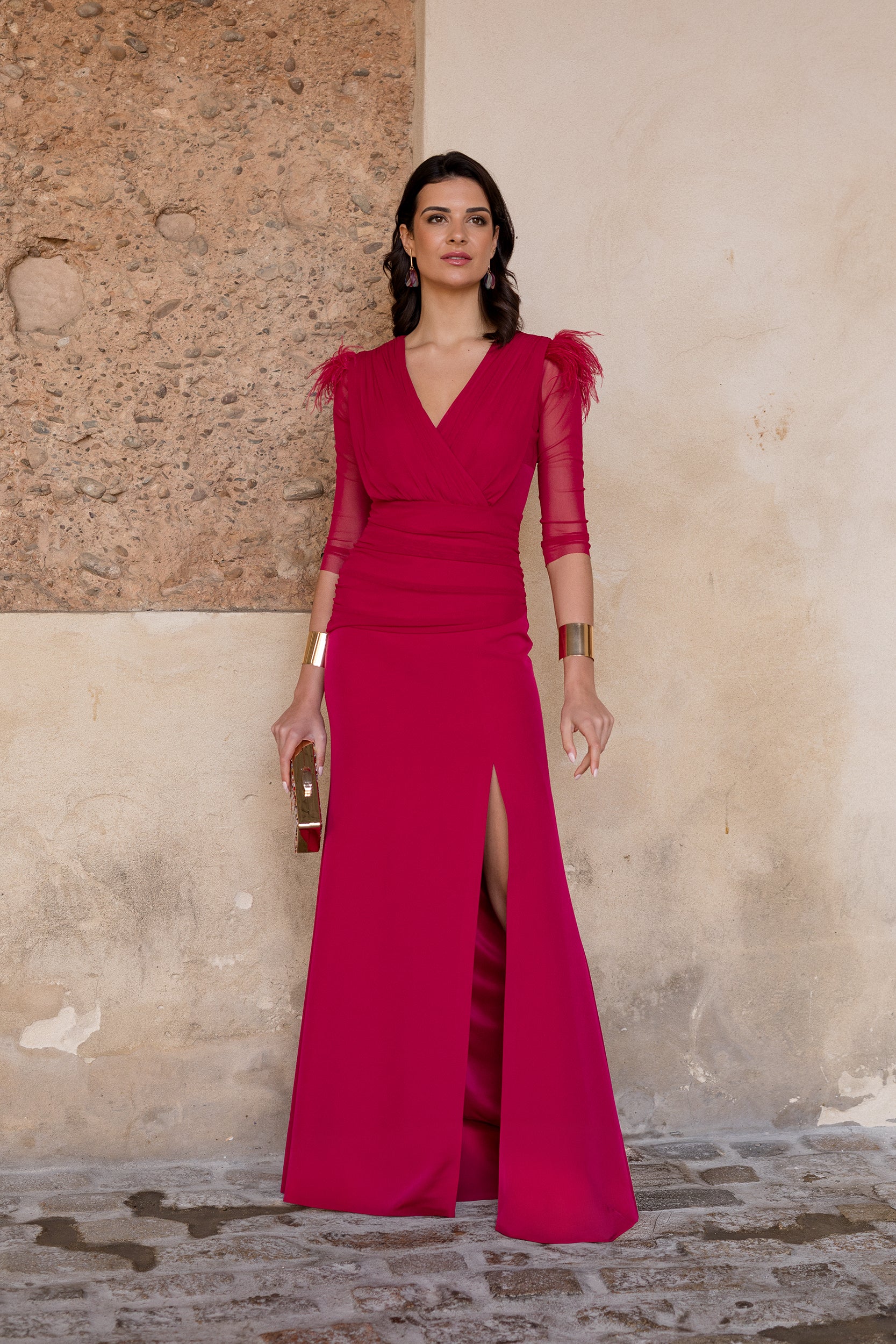 Deslumbra en tu próximo evento con este espectacular vestido largo en color turquesa, diseñado para realzar la silueta y aportar un extra de sofisticación. Su cuerpo drapeado con escote cruzado en pico estiliza el pecho y el torso, mientras que la falda recta con abertura delantera alarga visualmente la figura y permite lucir el zapato con comodidad. Las mangas semitransparentes al codo añaden un toque ligero y elegante, perfecto para bodas, fiestas y ocasiones especiales. El detalle de plumas en los hombros convierte este diseño en una pieza muy especial, ideal para invitadas que quieren destacar sin renunciar a la elegancia.