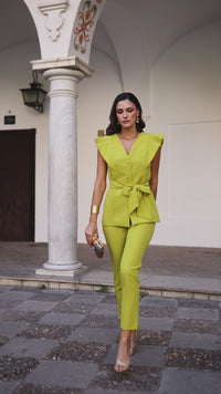 Los trajes pantalón son una tendencia esta temporada, este compuesto por dos piezas, la parte superior es un chaleco muy especial, te sentirás muy cómoda y a la vez la más elegante del evento, el cinturón lo podrás poner por delante o por detrás a tu gusto.
