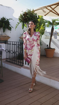 Si buscas un vestido de lo más especial, con un tejido estampado, flecos en el bajo que le aportan mucho movimiento, para una ocasión tan especial necesitas este vestido.